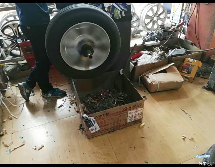 师傅在卸旧轮胎,看旧轮胎,至少还能跑5w,因为之前换上跑了也才不到4w公里