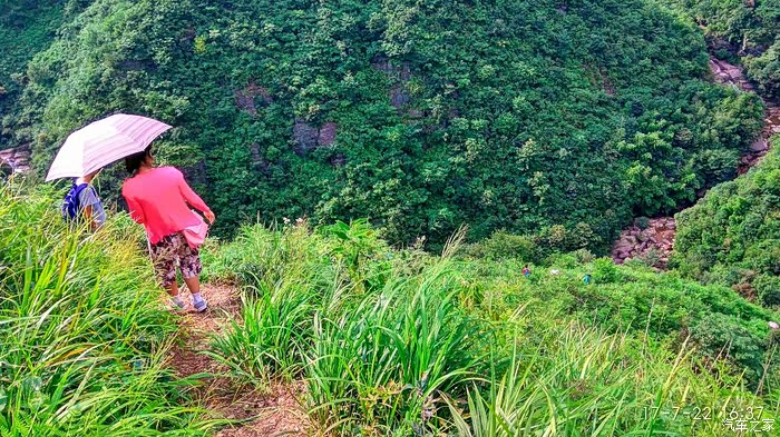 看到这些大车下坡,那叫一个惊险,急下坡&拐弯,轮子全杀死,车子仍在滑行,操作稍有不 慎,后果不堪设想。这些设备都是从源江那条道拉上来的,那边坡度要缓一点,即使这样,上大 坡也要一个挖土机在前面用钢缆拉才上得了,看来这些设备不是一般的重。 车队继续冲顶。 经过仔细核对卫星地图,同时结合路上施工人员提供的信息,终于看到了杀人寨的指示牌,虽然 就那么一块小小的破木板,却让一颗悬着的心落了地。 刚下去的时候还是烈日炎炎,但晴天霹雳也随之而来,谁也不会想到十几分钟就变了天,还真下 起雨来了,开始以为只是过路雨,没想到一落就是半小时,考虑到山洪的危险性,雨稍停即赶快 上山了。 冲冲忙忙爬到山顶,几近虚脱,居然见到一轮彩虹高挂蓝天,大自然的恩赐 天色已晚,接下来就是赶紧找营地。 大家都是完美主义,对营地要求:平坦草地,没积水,没牛粪,有花,视野开阔,难度不小。 几个车都分头找营地去了,就剩下大博越,赶紧来几张靓照吧,走得早不一定就先找到,,有道 是“有心载花花不开,无心插柳柳成荫”呢。 还真被我说中了,理想的营地不是找来的,是偶遇的。唯一不足就是有点牛粪,不过味道不大, 可以接受。 今天的目标是黄泥塘瀑布,从营地开车到老鹰崖农家乐,然后徒步1km左右到黄泥塘瀑布。 黄泥塘瀑布的水质清澈,颜色也更加绚丽多彩,从农家乐后山穿过到达公路,往右走 30m左右下路,沿着一条修剪过的小路直达河边,不过河,在河边右拐进一条小路,穿过一片竹 林后沿路继续前行,然后再次下到河边,过河溯溪而上250米左右达到黄泥塘瀑布。 黄泥塘瀑布水深达7米,小孩子还是在台阶下玩水比较安全。 下午一点半,看到天色又不太对劲,开始返程。 考虑到轿车上坡难度有点大,返程没有沿路返回,而是选择路工程车走的下山路线,速度开慢 点,基本无压力。在粉洞村附近与上山路线汇合。 返程下山的时候发现大博越一个问题,慢速下坡的时候瞬时油耗也不低啊,看来下山还是手动 好,在安全可控的前提下可以空档遛车。 总结一下本次出游几近完美,蓝天白云、风车、野花、瀑布、五彩池水、银河还有雨后彩虹,能 看到的风景基本都看到了,博越的越野能力也基本检验了,没毛病,基本上只要有路的地方都能 过,日常户外使用足够